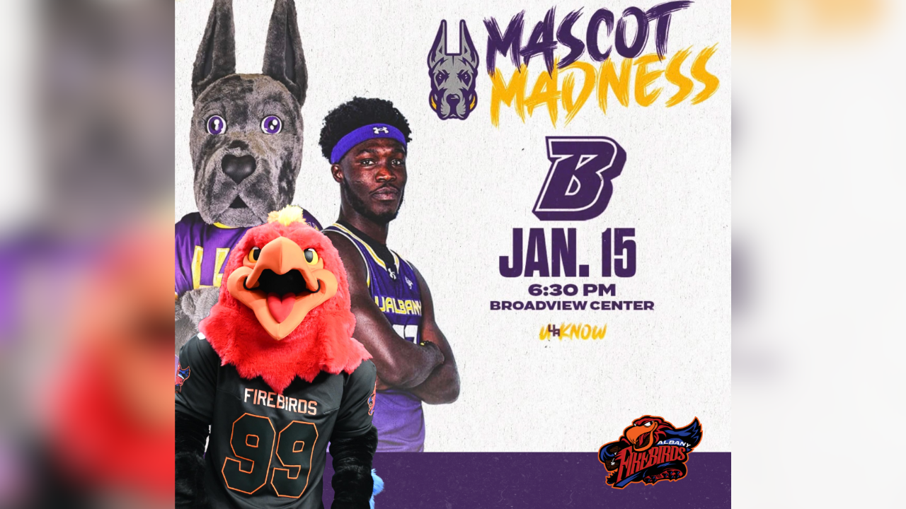 ALBANY, N.Y. — The Albany Firebirds are bringing their energy to UAlbany tonight as they join UAlbany’s Mascot Madness on Thursday, January 15, at the Broadview Center, as UAlbany men’s basketball takes on Binghamton. Tipoff for the game is scheduled for 6:30 p.m.