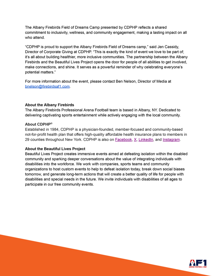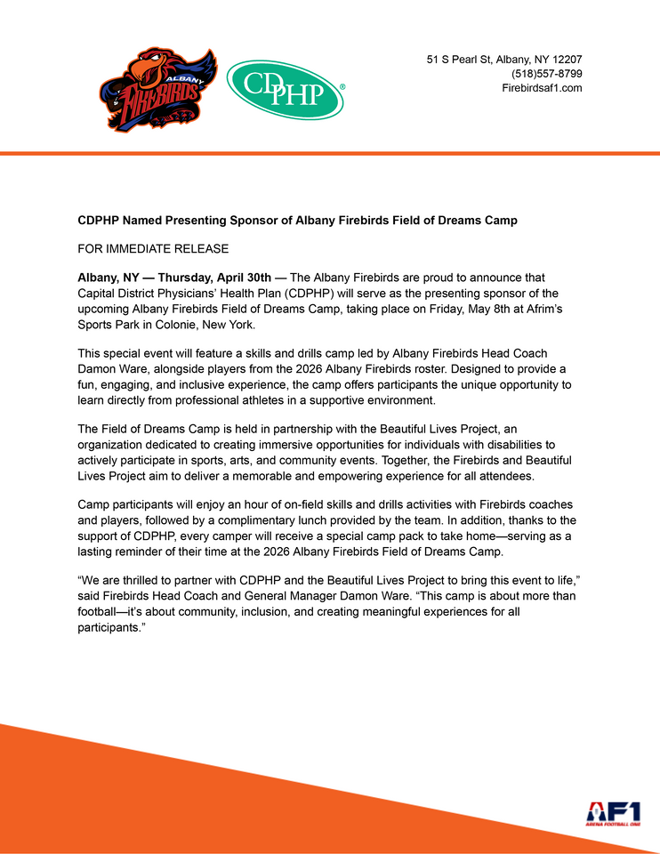 CDPHP Named Presenting Sponsor of Albany Firebirds Field of Dreams Camp